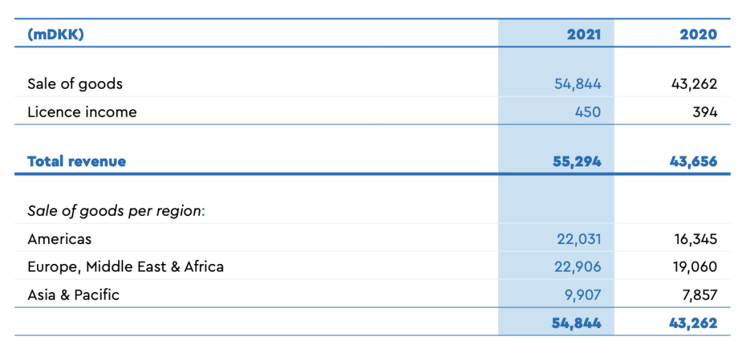 收入方面,乐高2021年营收同比增加27%至552.94亿丹麦克朗,主要来自商品销售和授权收入两部分。