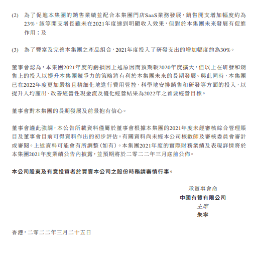 二是为了促进本集团的销售业绩并配合本集团门店SaaS业务发展,销售开支增加幅度约为23%,该等开支增长虽未在2021年达到明显收入效果,但对于本集团未来发展有促进作用;