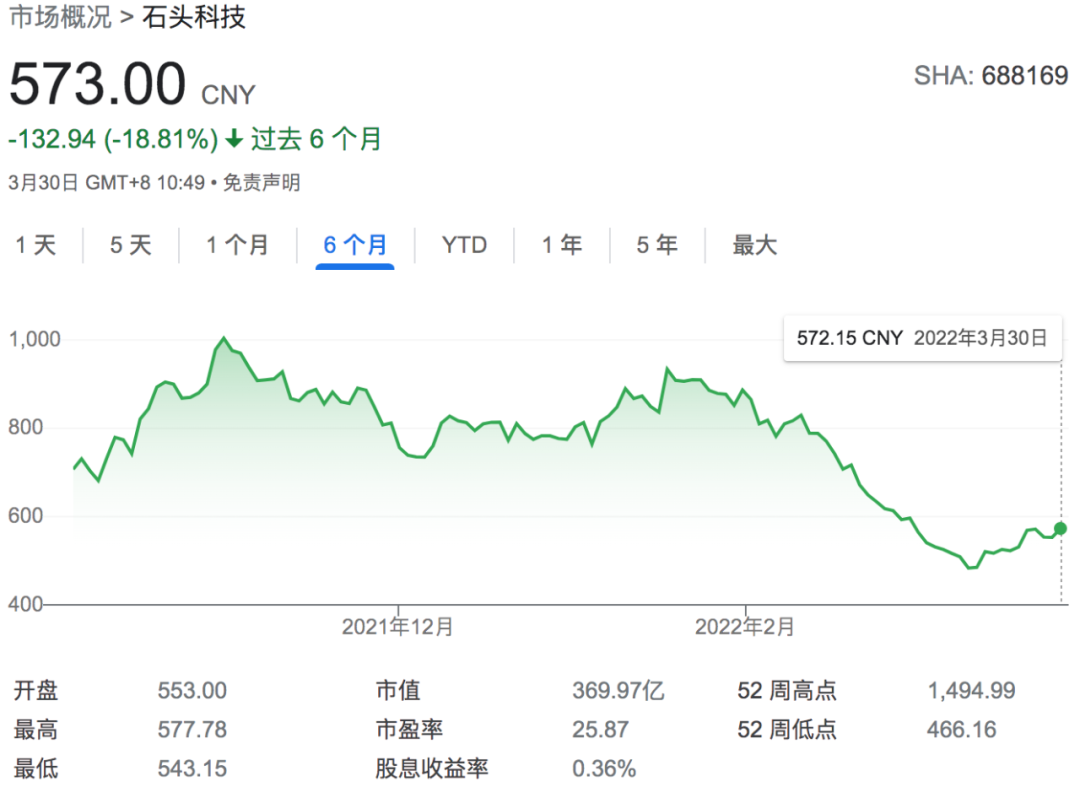以扫地机器人代表企业石头科技为例,自2020年2月登陆科创板,其股价曾于2021年6月攀升至1492.94元,公司总市值近千亿。2021年的6月是个节点,自此后,其股价进入“跌跌不休”的状态,截至发稿前,石头科技股价为573元。
