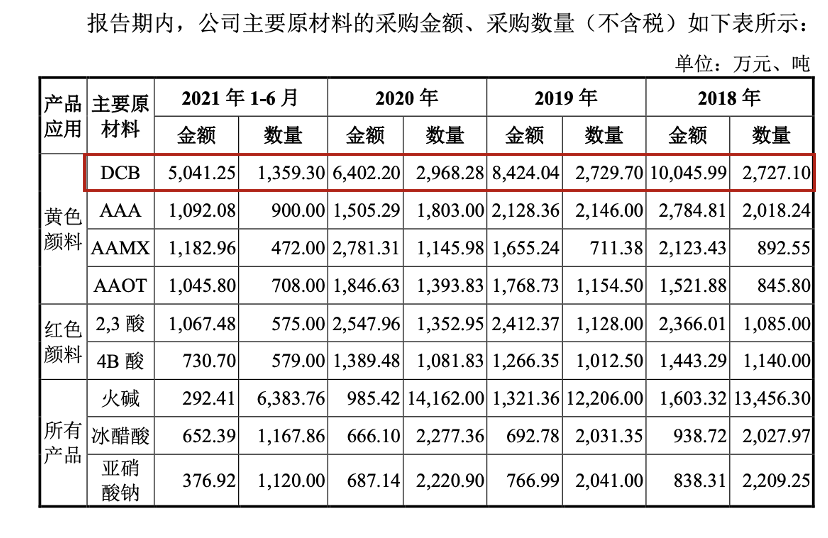 具体来看,2019年DCB平均采购单价同比下降16.23%,主要原因系2018年第三、四季度国内DCB生 产受到环保政策限制,导致DCB市场价格大幅上升,2019年有所回落;2020年,DCB采购单价同比下降30.10%,主要原因系受新冠疫情影响,DCB出口订单量大幅减少,导致DCB 市场价格随之下降;2021年上半年,DCB采购单价同比上升71.95%,主要原因系DCB上游原料生产企业因环保问题停产或限产导致DCB生产供不应求,价格高企。