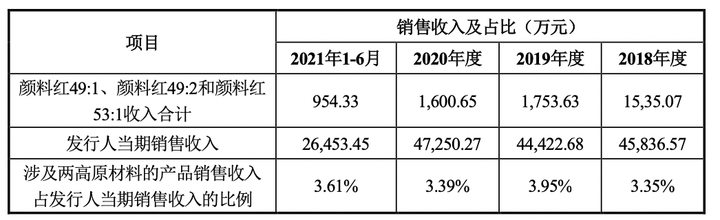 界面新闻记者通过梳理发现,关于业绩成长性、持续性风险主要表现为3个方面,一是境外销售的收入波动及政策、法规限制;二是以DCB为主的原材料供应、价格波动的影响,三是2021年-2023年我国有机颜料市场供大于求的市场格局,竞争加剧的风险。