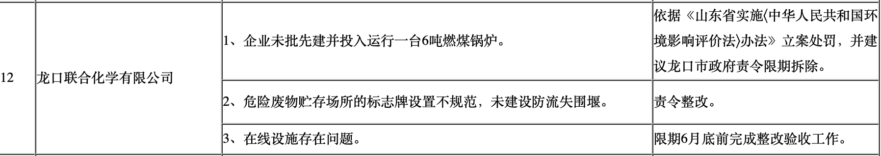 此外,据胶东在线此前报道,烟台市环保局联合市公安局开展了2015年第一次环保集中大检查,对部分违法企业进行分批次曝光,其中联合化学的名字赫然在列。