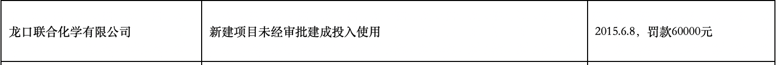据烟台市生态环境局网站,在2015年二季度行政处罚信息公开表中,联合化学因新建项目未经审批建成投入使用被罚款6万元。