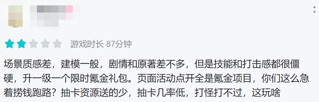 即便抛开人物相似度不说,整个游戏场景都显得过于粗糙。比如骑马前进时,马飘在空中;打斗中漂浮感强而PVP打击感弱,甚至体验感差到让不少人选择自动攻击……诚然,就当下市面上的MMORPG游戏来说,抄袭、“换皮”、“缝合”等现象早已屡见不鲜,但经过长时间创作的《庆余年》手游交出这样一份答卷,难免显得过于敷衍。