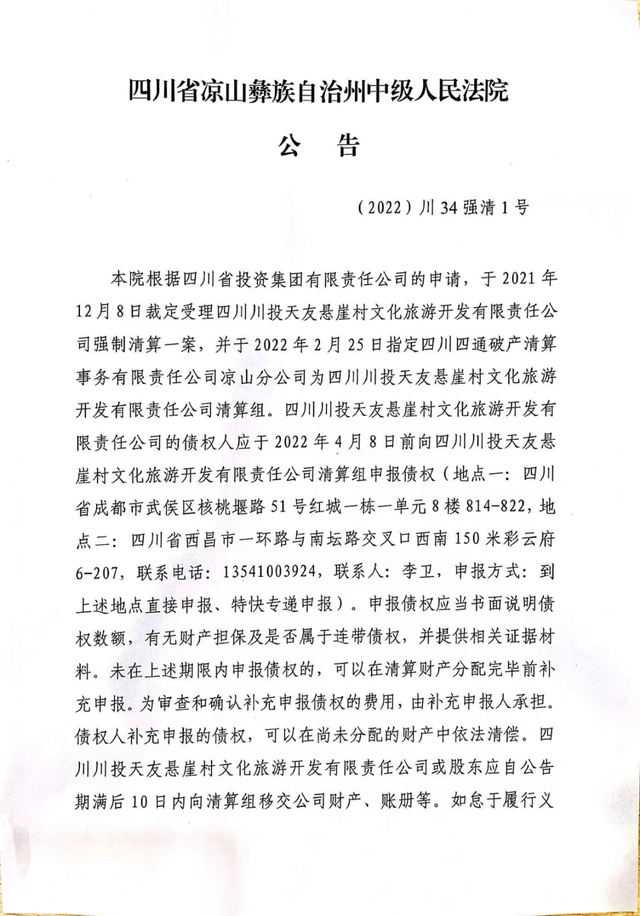 3月29日,新旅界(LvJieMedia)在全国企业破产重整案件信息网了解到,根据四川省投资集团有限责任公司(以下简称“川投集团”)的申请,四川省凉山彝族自治州中级人民法院于2022年2月5日指定四川四通破产清算事务有限责任公司凉山分公司为四川川投天友悬崖村文化旅游开发责任有限公司(以下简称“川投悬崖村公司”)清算组。