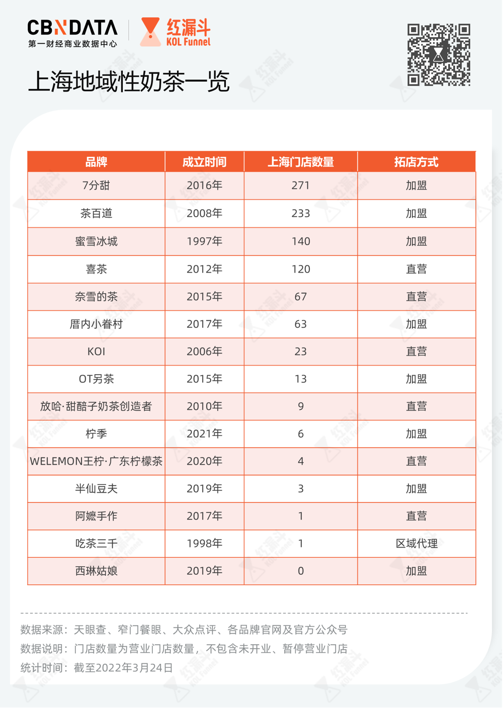 窄门餐眼数据显示,15个奶茶品牌按照上海门店营业总数排名,7分甜、茶百道以超过200家门店包揽TOP 2,蜜雪冰城、喜茶、奈雪排名TOP 3-5,门店数量分为为140家、120家和67家。近半品牌上海门店数量不到10家,其中西琳姑娘2021年起营业的唯一门店已经歇业。