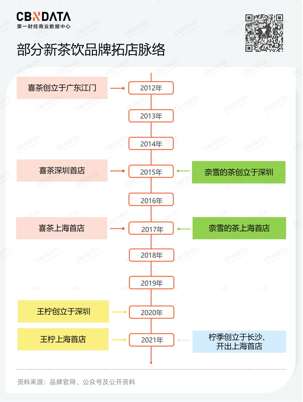 新一代茶饮比起前辈网红们在城市拓展方面显得更加激进。对比来看,2012年,喜茶的前身皇茶创立,2015年喜茶正式更名,先在以深圳为代表的的华南地区试水,直到2017年才来到上海开店。奈雪的茶从深圳开到上海也经历了两年多的时间。