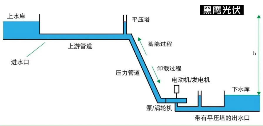 离河抽水蓄能项目通常包括一对人工水库(每个面积为几平方公里),彼此靠近(相隔几公里),但海拔不同200 -1200 米的高度差),通过管道或隧相连接。在晴天(光伏 )/刮风(风电 )的日子里,下层水库中的通过涡轮机被抽到山上的上层水库来回收能量。