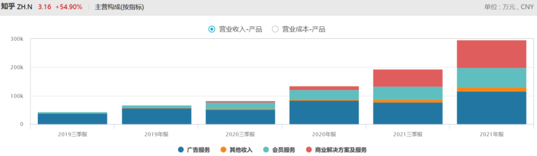 上市后,知乎(NYSE:ZH)商业化开始加速,并于2020年推出商业内容解决方案,为商家和品牌提供有效的基于内容的线上营销解决方案,并将优质的商业内容和营销工具无缝集成到在线内容社区中,从而并加速了知乎商业化进程,并进一步优化收入结构。这一点在财报上也得到充分体现:商业内容解决方案业务在2021年全年收入为9.74亿元,较2020年增长617.2%,成为增速最快的业务。