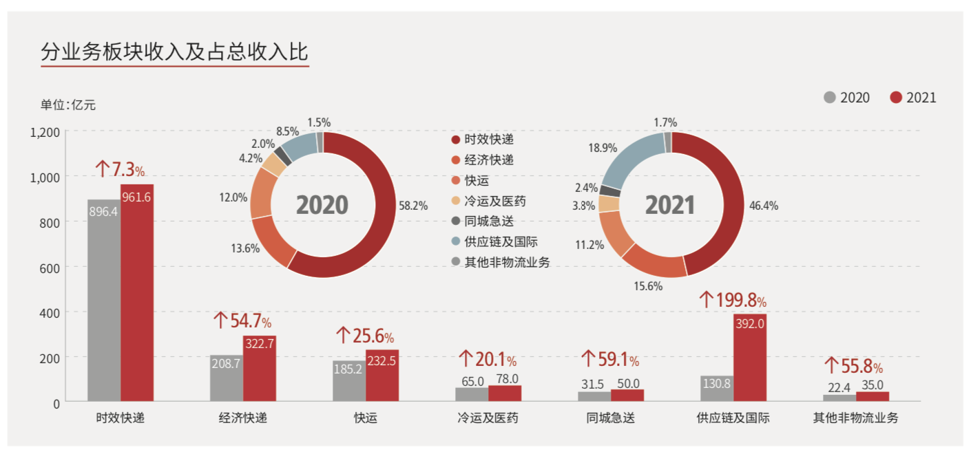 分业务来看,去年,顺丰控股整体营收增长约35%,其中,供应链及国际业务、同城及送、经济快递收入增幅最为明显,分别约为200%、59%和55%;而随着快递业务逐渐下沉,公司主打产品时效快递收入仅增长7.3%,增速远低于其他业务。