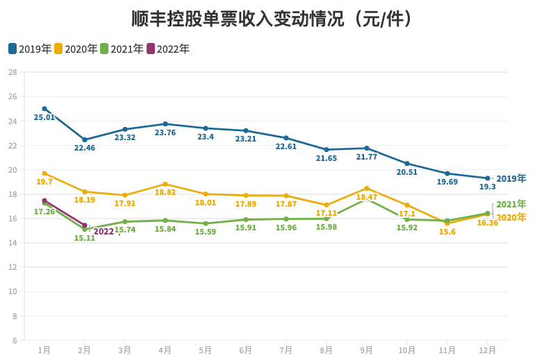 不过,随着各地陆续出台政策干预快递行业恶性竞争,快递行业单票收入在2021年年底有所改善。顺丰控股速运业务单票收入在去年前10个月连续同比下降后,终于在11月、12月回暖,达到与2020年基本持平。今年1、2月份,速运单票收入较上年同期分别增长3.80%和5.46%,不过与2020年相比仍有较大差距。