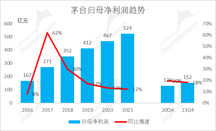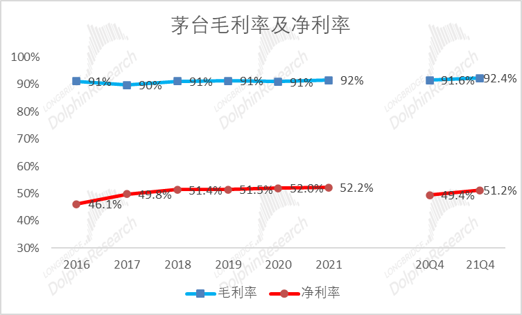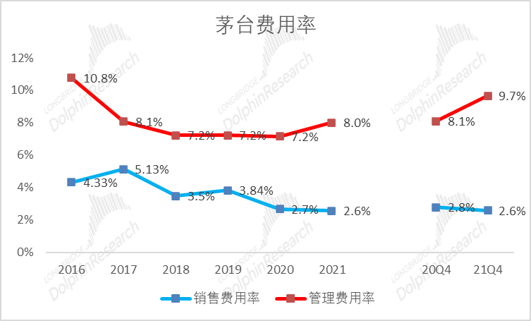 21第四季度毛利率92%,同比小幅上升,净利率51%,同比也小幅上升,主要由于第四季度高端茅台酒收入占比提升,以及茅台销售费用率有所小幅下降,管理费用率上升但整体属于可控范围。