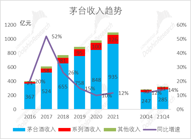 贵州茅台2021年单四季度营业总收入324亿元(+14%),归母净利润152亿元(+18.1%),扣非净利润152亿元(+16.1%),环比增速有上升明显,同比增速继续保持大双位数增长态势,此前市场普遍一直预期归母净利增速为15%左右,海豚君认为主要是第四季度该公司加大了茅台酒投放量高于市场预期,茅台酒增速环比提升带动公司整体吨价提升,进而提升公司盈利能力。
