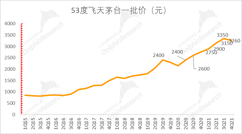 而2022年第一季度,公司预计实现营业总收入331亿元左右,同比增长18%左右,预计实现归母净利润166亿元左右,同比增长19%左右,第一季度的业绩增速已远超去年同期,顺利实现了“开门稳”、“开门红”,长桥海豚君认为高增主要因非标及直营渠道占比提升,叠加近期经销商基本完成3月打款,非标发货量较大,22年全年茅台业绩高增确定性得到了保障。