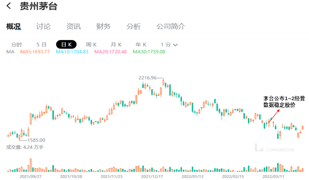 因此,这次贵州茅台首次公布1-2月经营数据,也是特意选在了公司股价连续下跌多月的时候发布,具有一定的稳定股价、安抚市场投资者的作用。