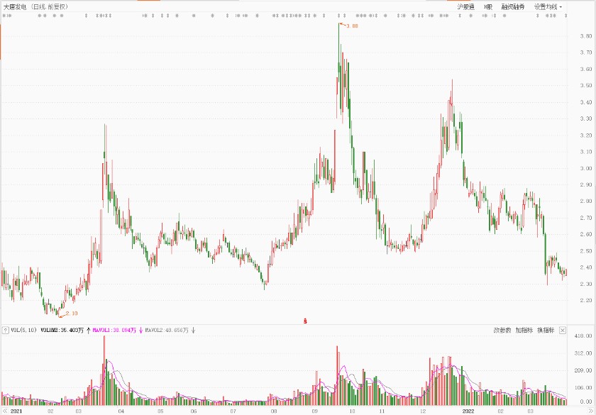 2021年,大唐发电的股价全年经历了“三起三落”,在3月下旬、9月下旬和12月下旬出现了三个股价“波峰”,而且随后都出现了一轮较大幅度的回落。截至2022年3月30日收盘,大唐发电股价收于2.39元/股,和去年3月中旬的股价相当,又回到了一年之前的“原位”。