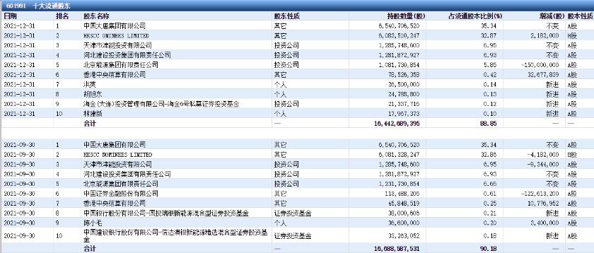 另外,从2021年下半年的前十大流通股股东增减持情况看,北京能源集团有限责任公司减持了1.5亿股;香港中央结算有限公司先后增持1077.70万股、3267.78万股;天津市津能投资有限公司在第三季度减持934.40万股;在第三季度增仓340万股的个人股东陈小毛,在第四季度已退出名单。