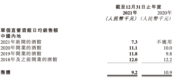 从数据来看,海伦司2021年新开业的酒馆日均销售额为7300元,远低于2020年开业酒馆的1.11万元和2019年的1.18万元。扩张道路上出现的“新生”,业绩有点拉胯。