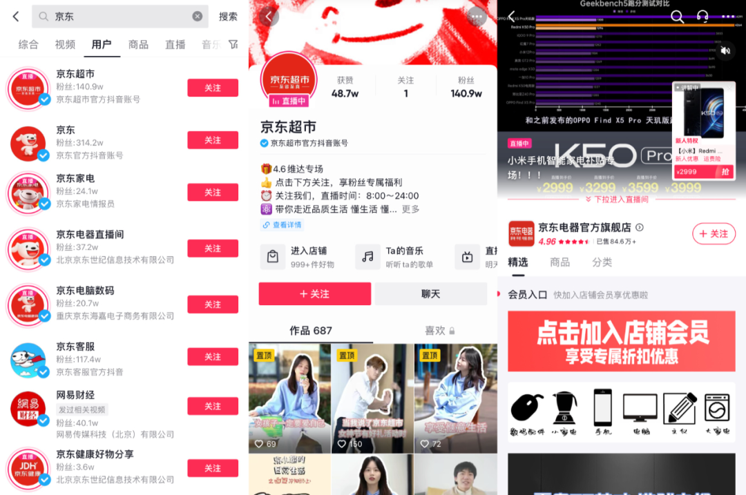 和快手一样,抖音和京东的合作明显比和淘宝深入。京东在抖音上有自己的小店,京东商品还可以进入抖音小店的选品池。但抖音和淘宝、拼多多的合作则只侧重于信息流广告。
