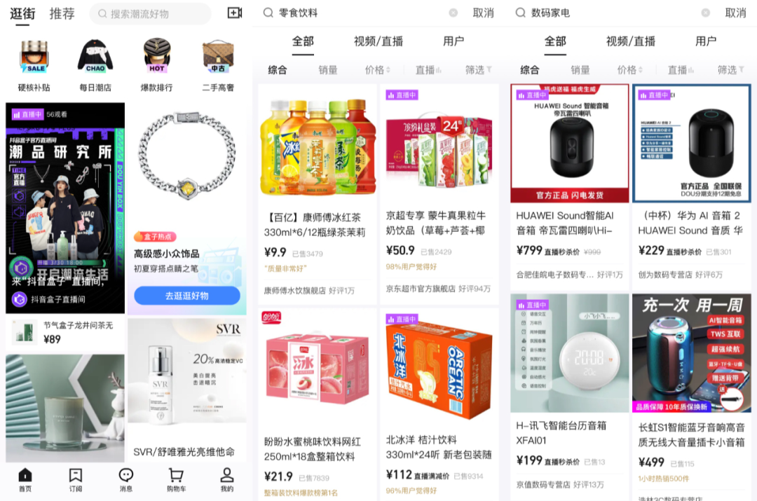 “盒子”目前只有“硬核补贴”、“时尚潮流”、“美妆爆品”和“二手高奢”四大类,但也为更多类目保留了空间,比如,在抖音盒子中搜索零食饮料、日用百货、数码家电也能出现百草味、隅田川、心相印和OPPO。