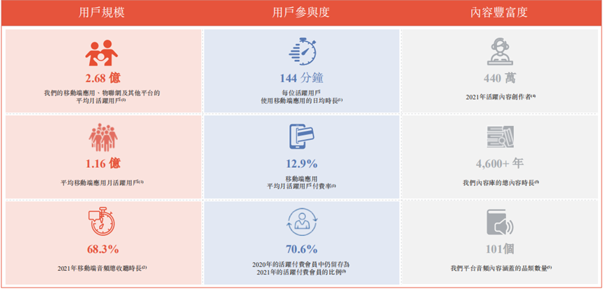 公司全场景平均月活跃用户达2.68亿,较2019年的1.4亿接近翻倍增长。其中,移动端平均月活跃用户达1.16亿,移动端用户日均收听时长为144分钟,总收听内容时长达17,441亿分钟,在全行业中收听时长占比达68%。