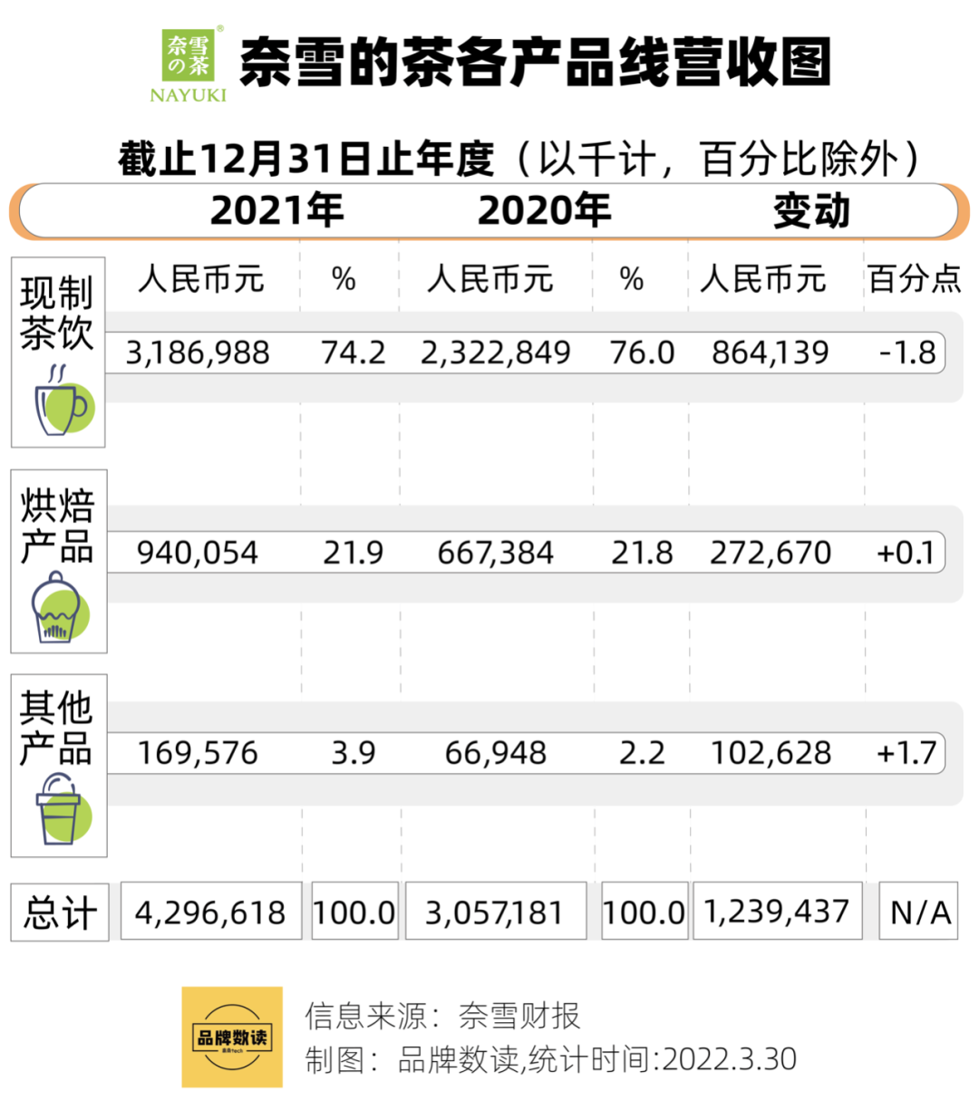 而零售产品的上新效益也在数据上得以体现。财报显示,此前名不见经传的零售产品成为了2021全年增速最快的产品线,增幅高达153%,而在集团内的营收占比也从2.2%跃至3.9%。与之相对的则是现制茶饮和烘焙产品仅为37%与40.9%的营收增幅。