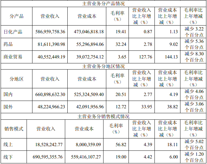 其中,日化产品为两面针的最主要营收支柱,约占当期总营收的82%;药品业务约占公司当期总营收的11%,其余为商品贸易业务。