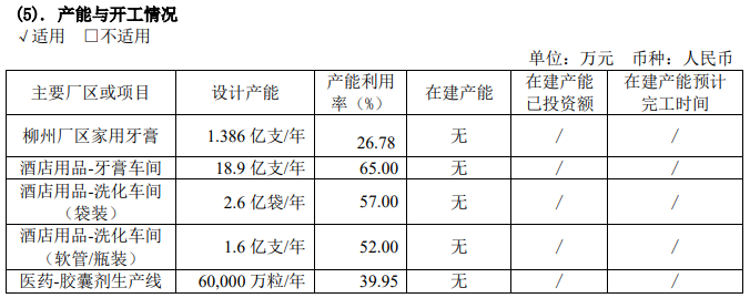 从产能来看,两面针酒店用品、酒店牙膏等产品的产能利用率较高,而家用牙膏产能利用率较低。不过即使是酒店牙膏车间,产能利用率也只是65%,公司产能远高于实际销售额。