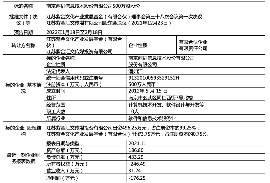 近日,江苏省产权交易所网站显示,南京西祠信息技术股份有限公司以1元的挂牌价格转让500万股股份(占总股本100%),目前该项目已截止报名。