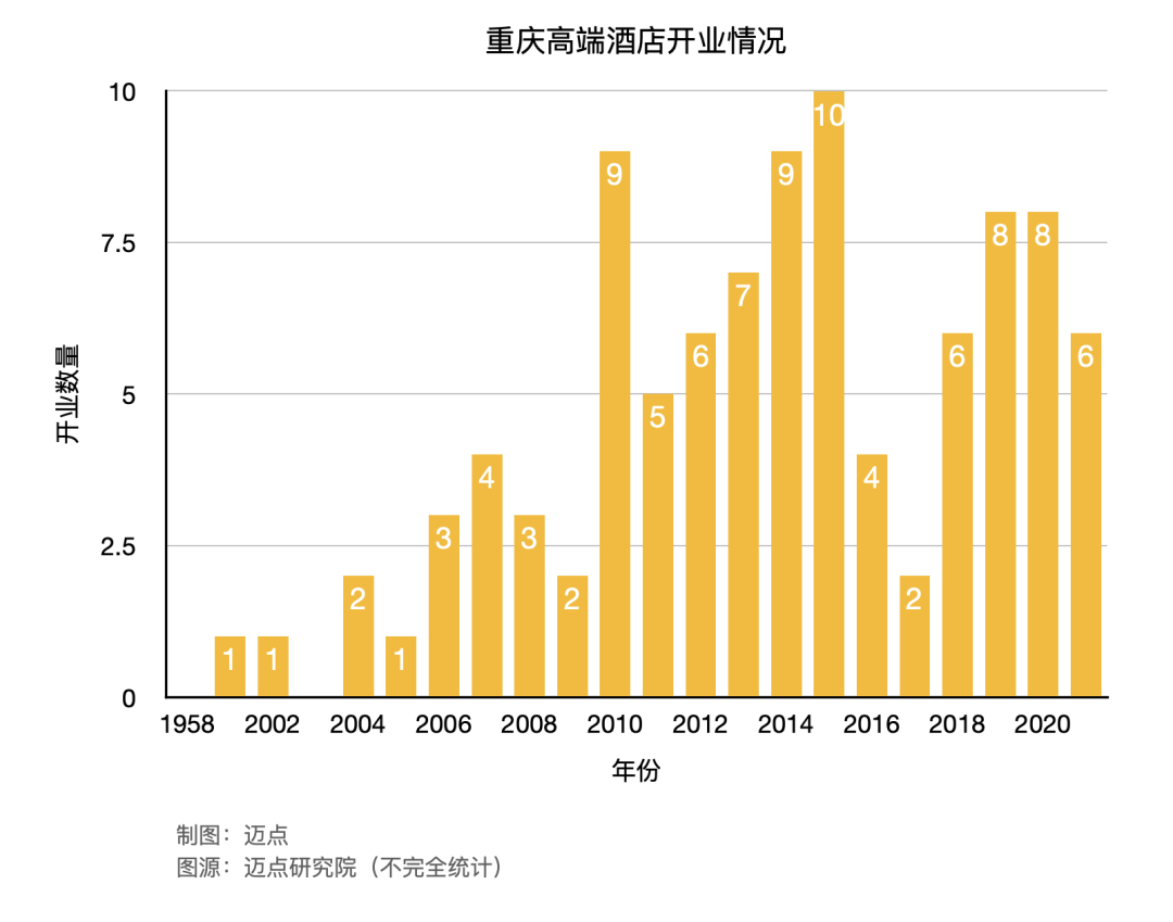 第一,迅猛的开业速度。根据迈点研究院统计,重庆在近20年间共有97家高端酒店开业,平均每年都有近5家开业,而根据实际数据,有不少年份甚至达到了6-8家的开业数量,这在同级别城市中是很难见到的情况。