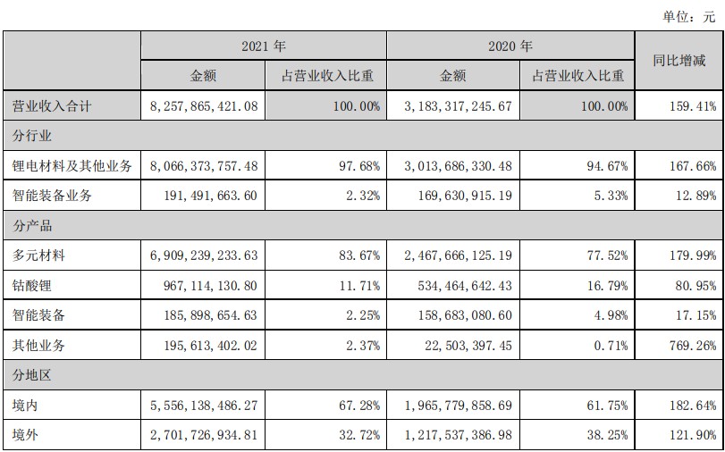 2021年度,当升科技营业收入按产品分类,“多元材料”实现收入69.09亿元,占营业收入的83.67%,该类产品上一年的收入为24.67亿元;“钴酸锂”实现了9.67亿元收入而居于其次,该类产品上一年收入为5.34亿元。总体上看,锂电材料及其他业务实现的收入占比达到97.68%。