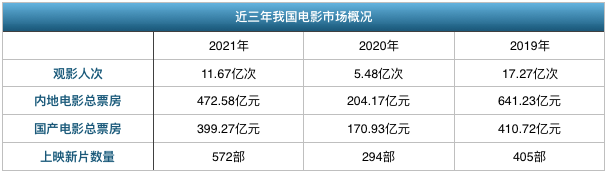 从上图可以看到,2021年,我国电影市场观影人次、总票房等数据均出现了大幅回暖,但与更早时候相比,仍然有着较大的差距。