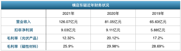 在广阔市场需求的带动下,2019年至2021年,横店东磁营业收入从65.63亿元升至126.07亿元,两年时间,基本实现翻倍;扣非净利润亦有着53.57%的涨幅。当然,诱人的蛋糕也吸引了诸多抢食者,竞争愈加激烈的情况下,如何应对下滑的毛利率也是需要考虑的问题了。