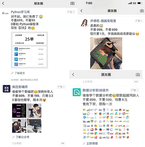 初次看到这些广告,很难不心动。但若每天都能在朋友圈刷到相同的文案,每次的课程内容却不一样,就难免令人起疑:我与财富自由之间的距离,真的只差那1块钱吗?