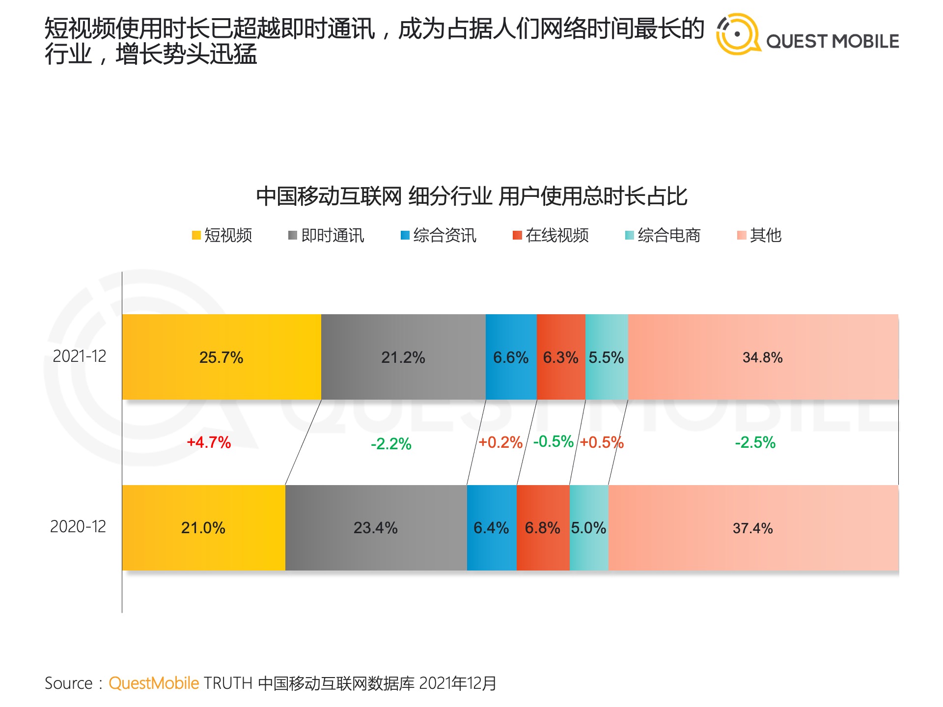 根据“同学”们的反馈,大家看到广告主要来自朋友圈和抖音。从数据来看,两大APP分别对应移动互联网的流量两极。QuestMobile发布的数据显示,2021年12月,短视频和即时通讯的用户使用时长在全网分列第一、第二。