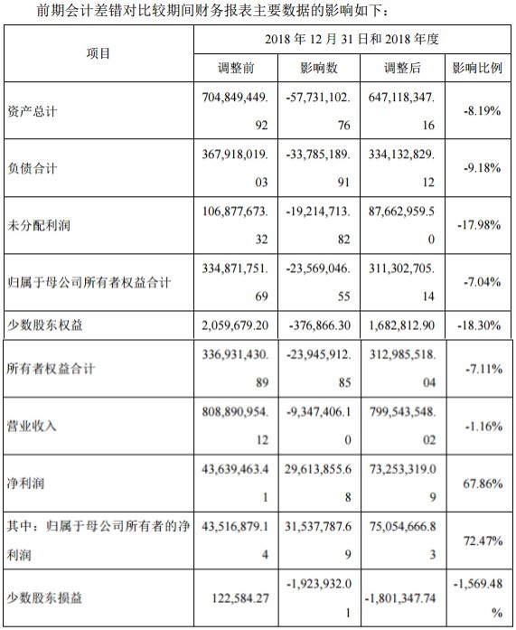 2020年6月30日,距离终止在新三板挂牌前不久,永裕家居披露了《前期会计差错更正公告》,对2018年年度财务报表存在的会计差错进行了追溯调整,更正了多项财务科目。其中,调整减少了营业收入934.74万元(影响比例-1.16%),调整增加了净利润2961.39万元(影响比例+67.86%)。
