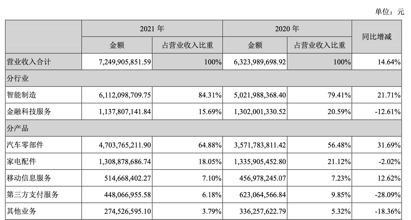 海联金汇表示,其所处的行业包括智能制造和金融科技。其中,金融科技板块涉及移动信息服务和第三方支付服务。以行业区分,2021年,金融科技服务的营收贡献为11.37亿元,同比收窄12%;占总营收的比值从20.59%降至15.69%;营业成本为8.58亿元,毛利率下降。