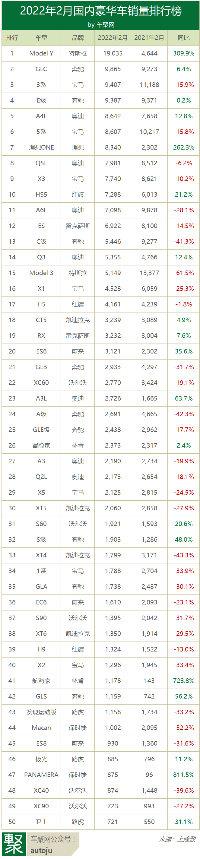 红旗仍为二线豪华领头羊,同比增长10%,月销超1.4万辆。红旗HS5位居豪华车型榜第10位,销量为7,288辆。据悉,红旗2022年销量目标为45万辆以上,今年1-2月累计4.9万辆,这意味着,想要达成目标,接下来的10个月月均销量要4万辆以上,挑战难度巨大。
