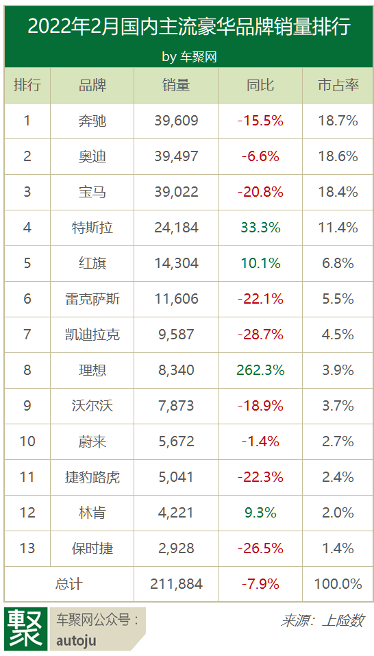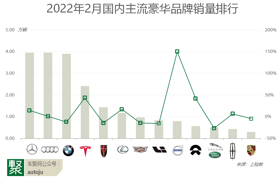 上险数显示,2月主流豪华车销量共计21.19万辆,环比下滑50.8%,同比下滑7.9%——略好于乘用车市场的-10.6%,占当期乘用车总量的18.3%。
