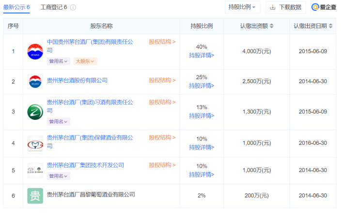 据爱企查数据显示,贵州茅台集团电子商务股份有限公司成立于2014年6月30日,注册资金高达1亿元,中国贵州茅台酒厂(集团)有限责任公司持股40%,贵州茅台酒股份有限公司持股25%,当前的状态为“注销”。