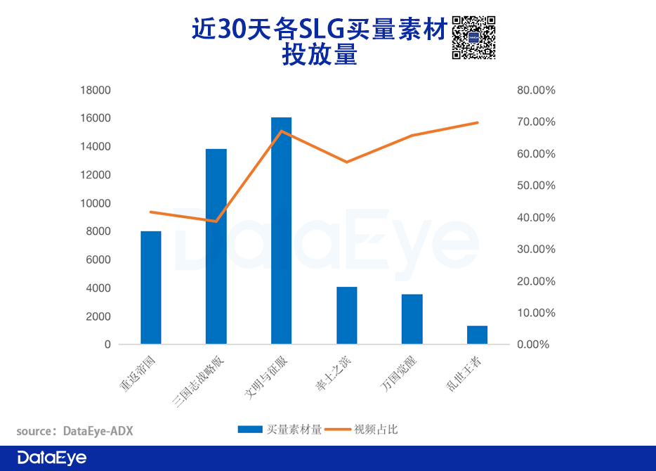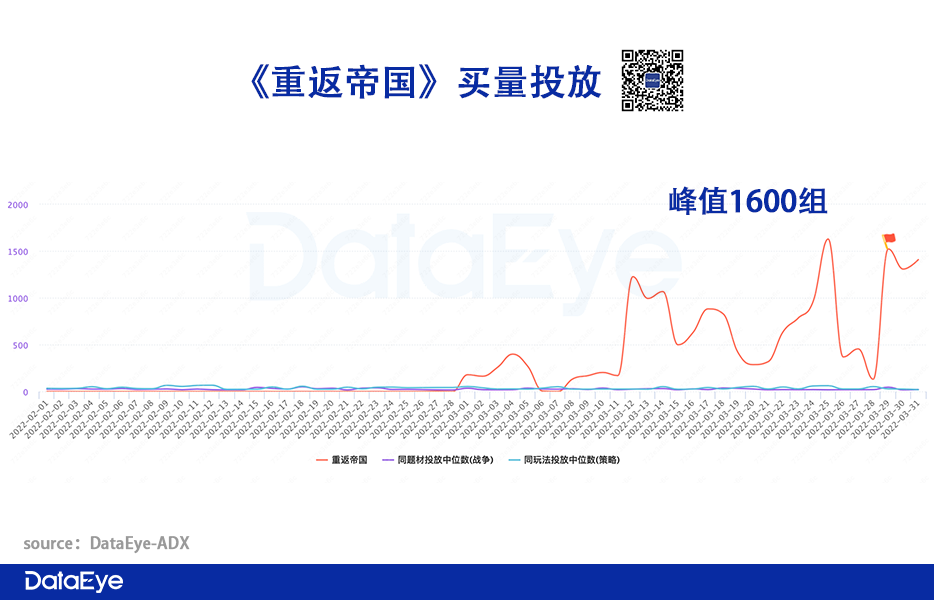 总体投放量较少。与《文明》《三战》两位“买量大户”相比,《重返帝国》近30天买量素材投放较少,峰值出现在3月25号也仅1600组,视频素材占比也属于中低水平。而当初《文明》上线当日就投了1.2万组。