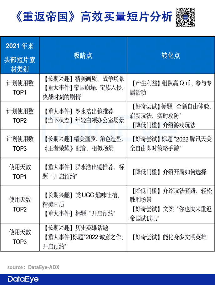 《重返帝国》常见的的高效买量短片套路是:吸睛点+游戏特色+转化点。这一套路与其它顶级SLG的打法基本一致——腾讯这次已接近阿里、网易、莉莉丝水平。