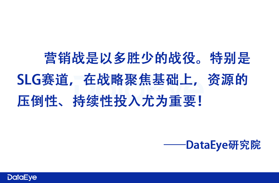 如果将SLG营销战比喻成古代战争,那么最重要的是:派出压倒性的兵力击退敌军(竞品),尽可能多地占领城池(用户心智)。而不是总想着“以少胜多”“省点兵力回来”——资源的压倒性投入和战略聚焦,尤为重要!