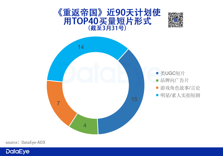 避免“保守、生硬”,从广告宣传,走向创意内容。此前我们分析腾讯发行的游戏,品牌向广告片以及图片海报往往较多,“品与效”的天平倾向“品”。《重返帝国》头部素材则改变了思路,广告属性较弱的类UGC短片最多,其次是明星/素人实拍短剧,品牌向广告反而最少。
