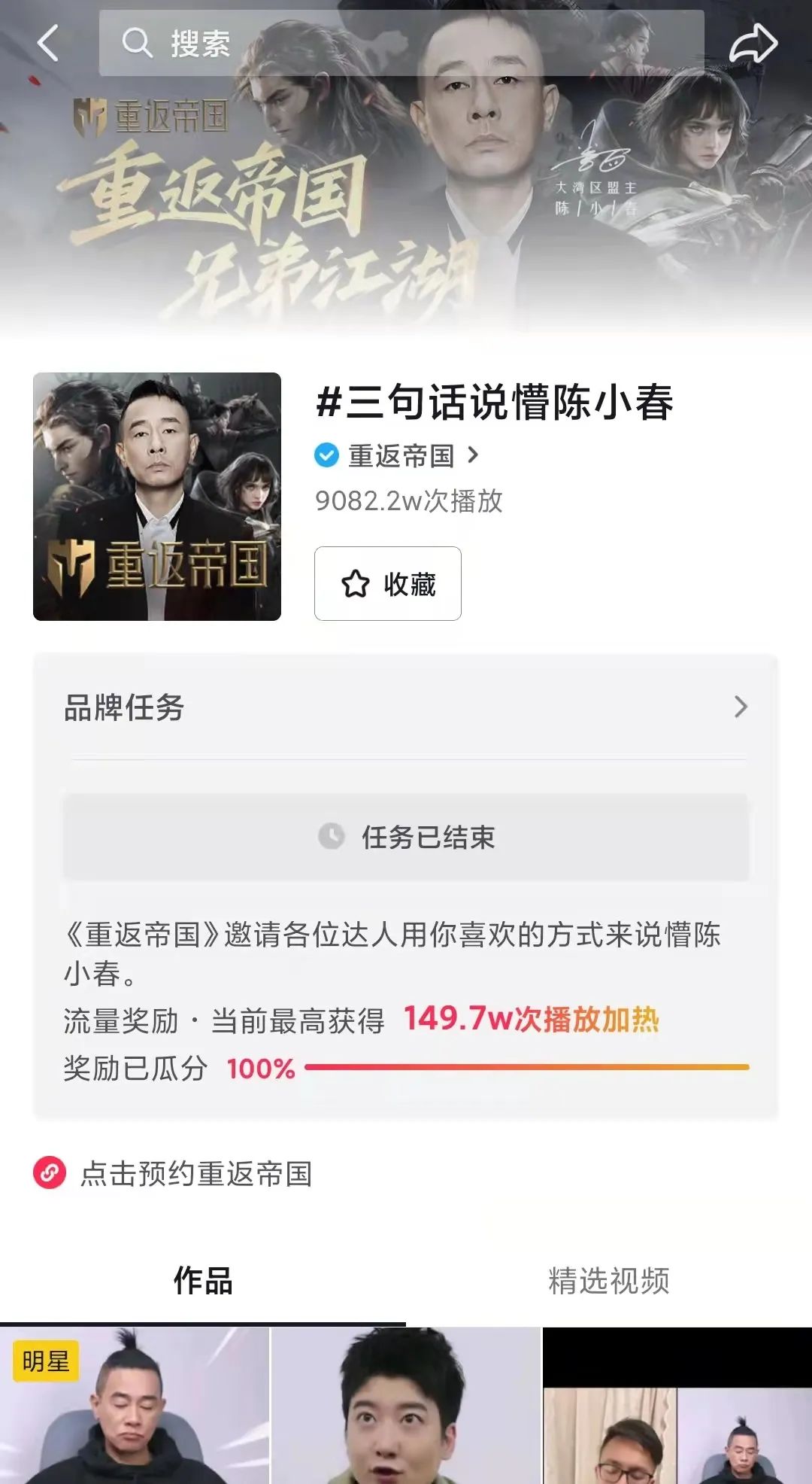 其中,#重返帝国话题共2.9亿次播放,而#三句话说懵陈小春话题(与陈小春固定视频内容合拍)共有9082万次播放,两项数据合计已超过#文明与征服的总播放量,达到SLG老兵《率土》《三战》的近一半。要知道,在抖音上,#乱世王者仅0.35亿次播放,《率土》《三战》可是运营了多年的。足见腾讯天美这次“彻底放飞”以流量、效果导向,而不是总想着给自家平台“充值”了,也取得一定效果。