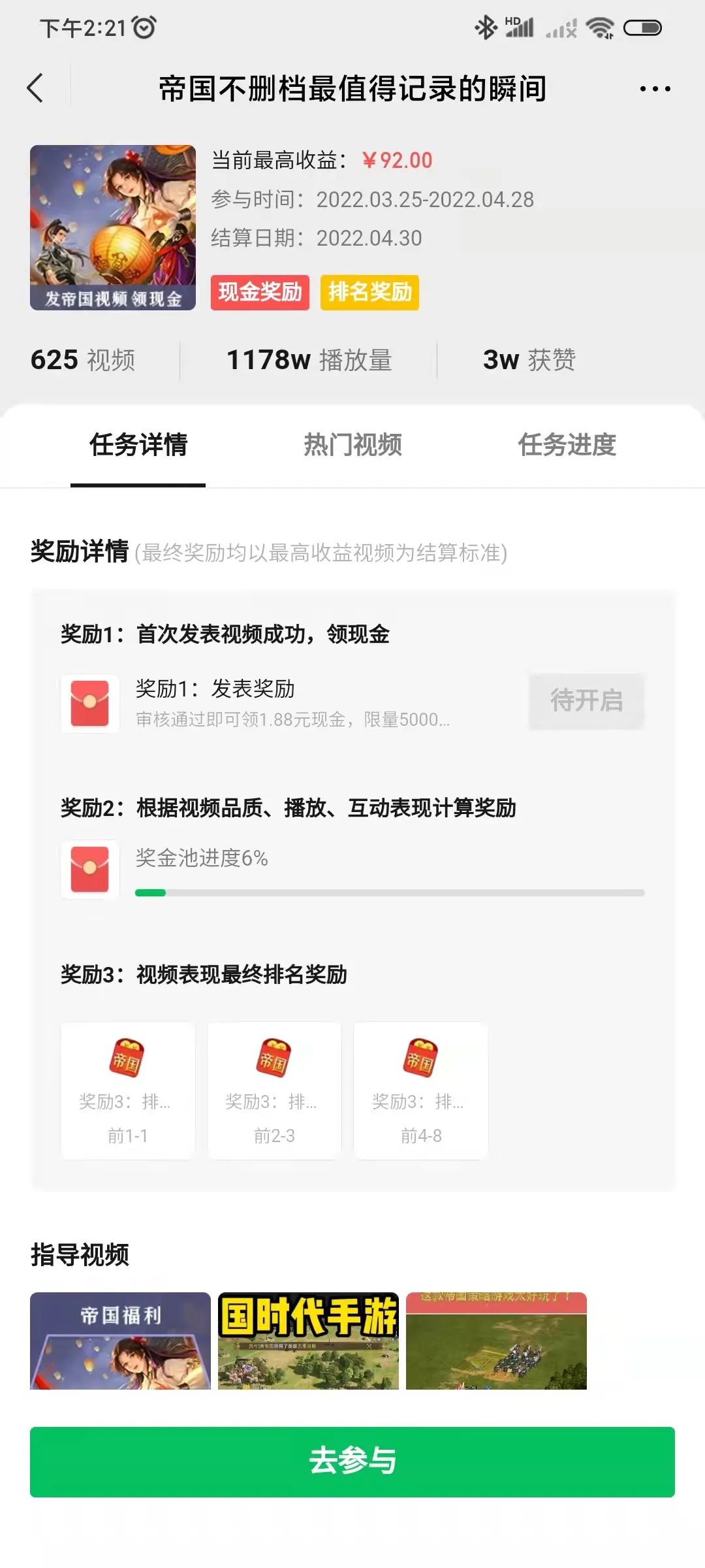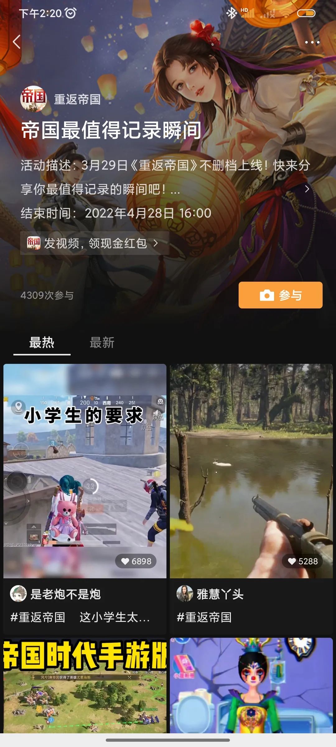 过去我们谈及腾讯游戏发行能力,往往绕不开短视频短板。视频号的快速崛起,让这一情况有些许改善。《重返帝国》在微信视频号上进行了“帝国最值得记忆瞬间”活动,邀请达人发布相关视频,瓜分奖金,目前有1178万播放量,共产生625支短视频。明显可以看出视频号试图效仿抖音、快手的游戏发行计划,只是目前还没有效果转化机制。视频号商业化的又一小步?
