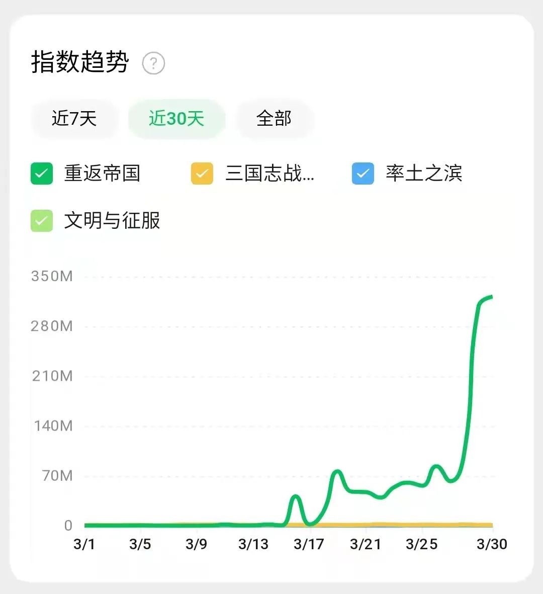 虽然偏向传播,但微信视频号对《重返帝国》而言也是较独特的,在流量加持下,竞品的近30天的微信指数,完全被“拉成一条趋近于0的直线”。