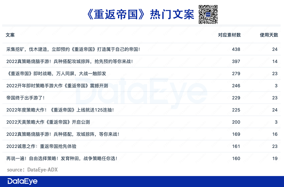 文案标题方面,“预约”、“即时”、“开启”、“大作”都是热门词,热门标题TOP3为:《采集挖矿,伐木建造,立即预约打造属于自己的帝国!》《2022真策略烧脑手游!兵种搭配攻城掠阵,抢先预约等你来战!》《即时战略,万人同屏,大战一触即发》《2022开年即时策略手游大作震撼开测》《帝国终于出手游了!》