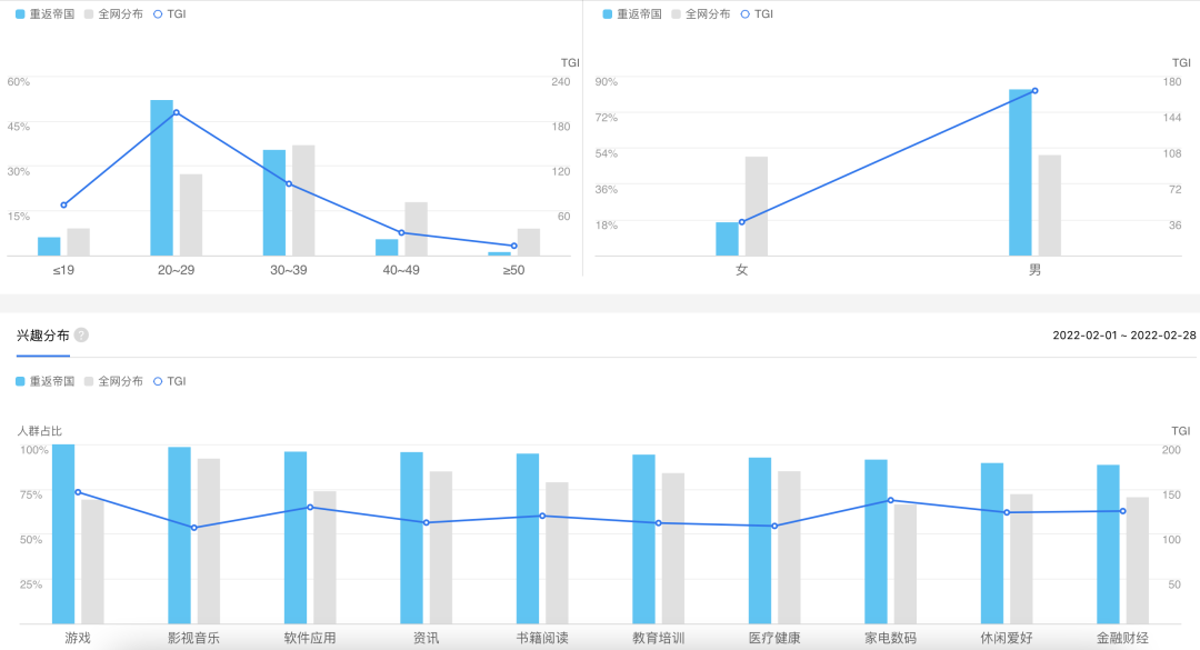 具备向年轻化破圈的潜力。百度指数的数据同样显示男性用户居多,不同的是20-29岁用户TGI大幅超过全网,同时超过了30-39岁用户,这说明用百度的年轻用户也较为关注《重返帝国》。
