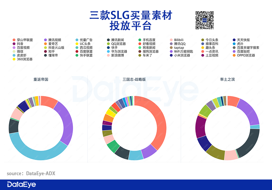 主投“腾讯系全家桶”。腾讯产品主投自家平台理所当然,《重返帝国》主投优量广告(占总素材的36.4%)腾讯视频(25.94%)腾讯新闻(7.83%)天天快报(4.93%)。此外,《重返帝国》还投了字节系的穿山甲联盟(8.77%)以及B站(6.05%)。反观阿里《三战》主投穿山甲(37.18%),而网易《率土》投放则更多元、均衡。